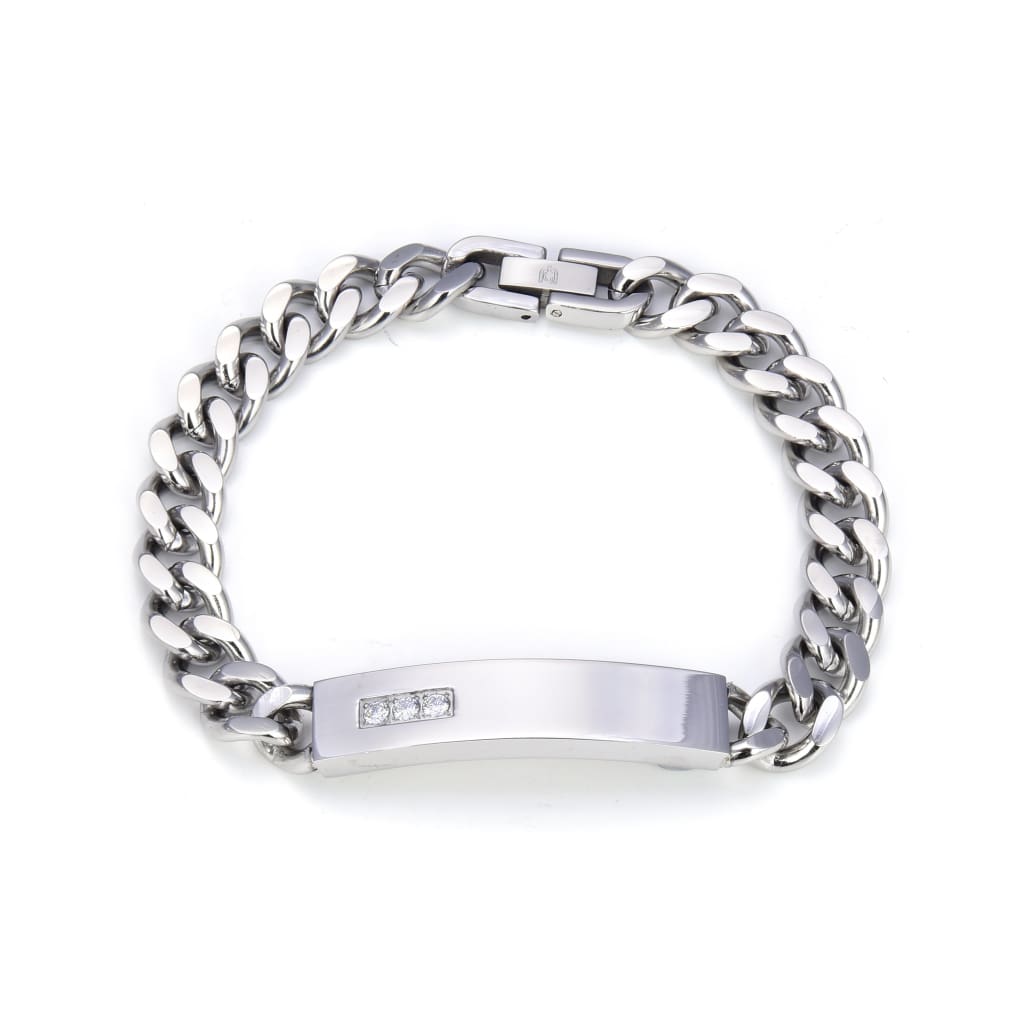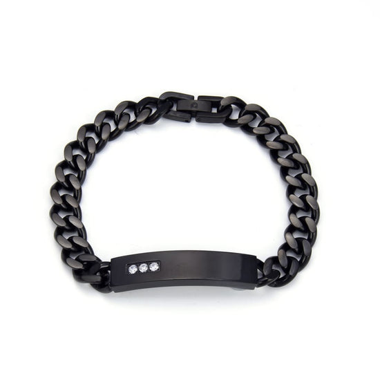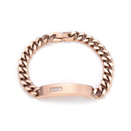 A luxurious and bold design, this link bracelet features stainless steel with IP gold, IP black, and IP rose gold plating. Accented with an ID bar and stones, it delivers a sophisticated look that fits wrists up to 8 inches.