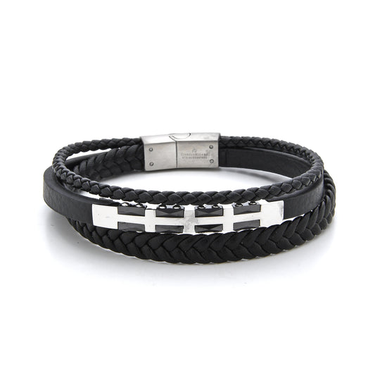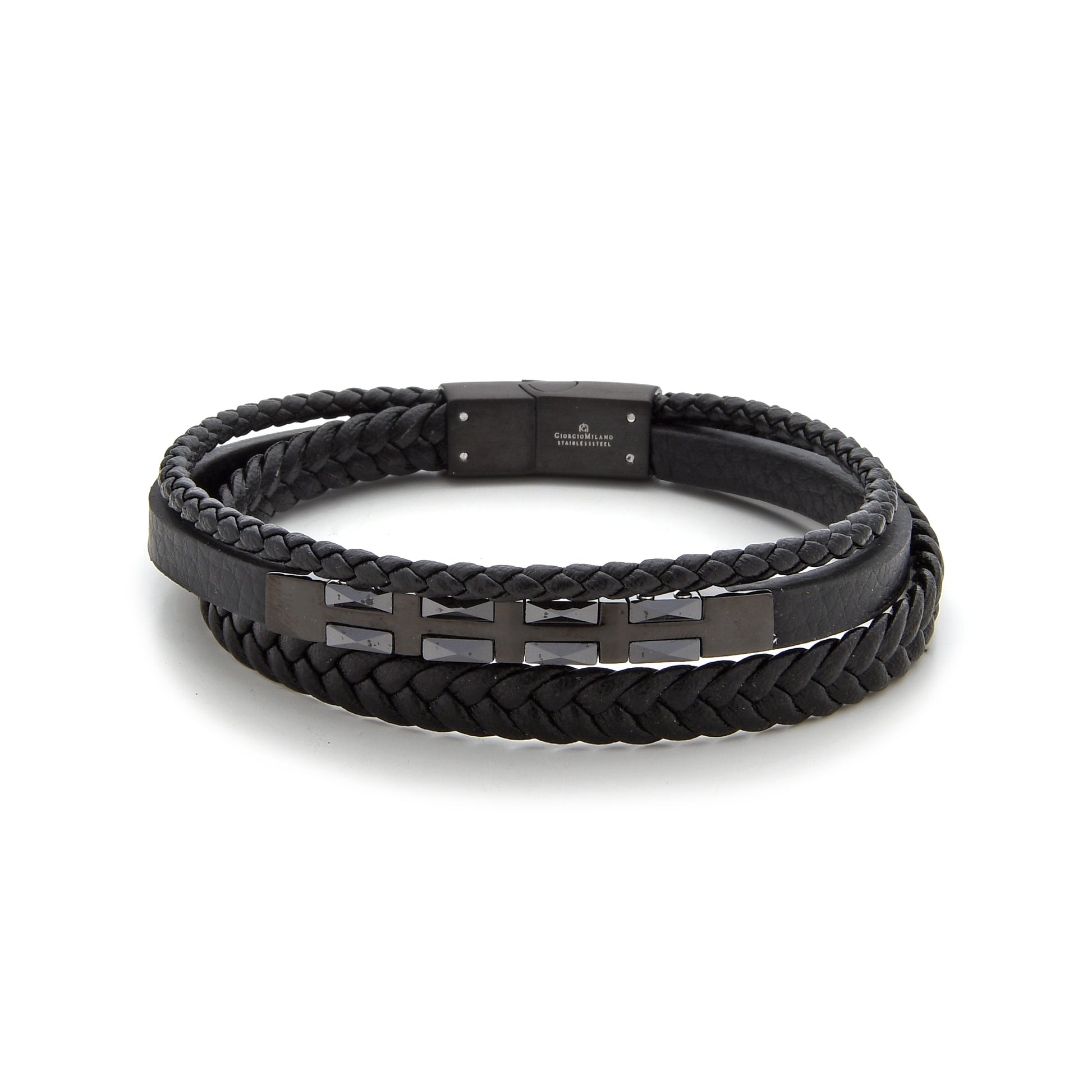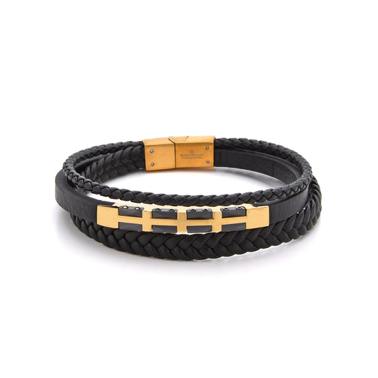 The Giorgio Milano 2091 bracelet blends rugged craftsmanship with contemporary style. Designed with three premium leather strands—two braided and one smooth—it features a sleek geometric stainless-steel bar centerpiece for a bold, modern look. Available in Black IP, Gold IP, and Silver finishes, this bracelet offers versatility and effortless masculine appeal for everyday wear.