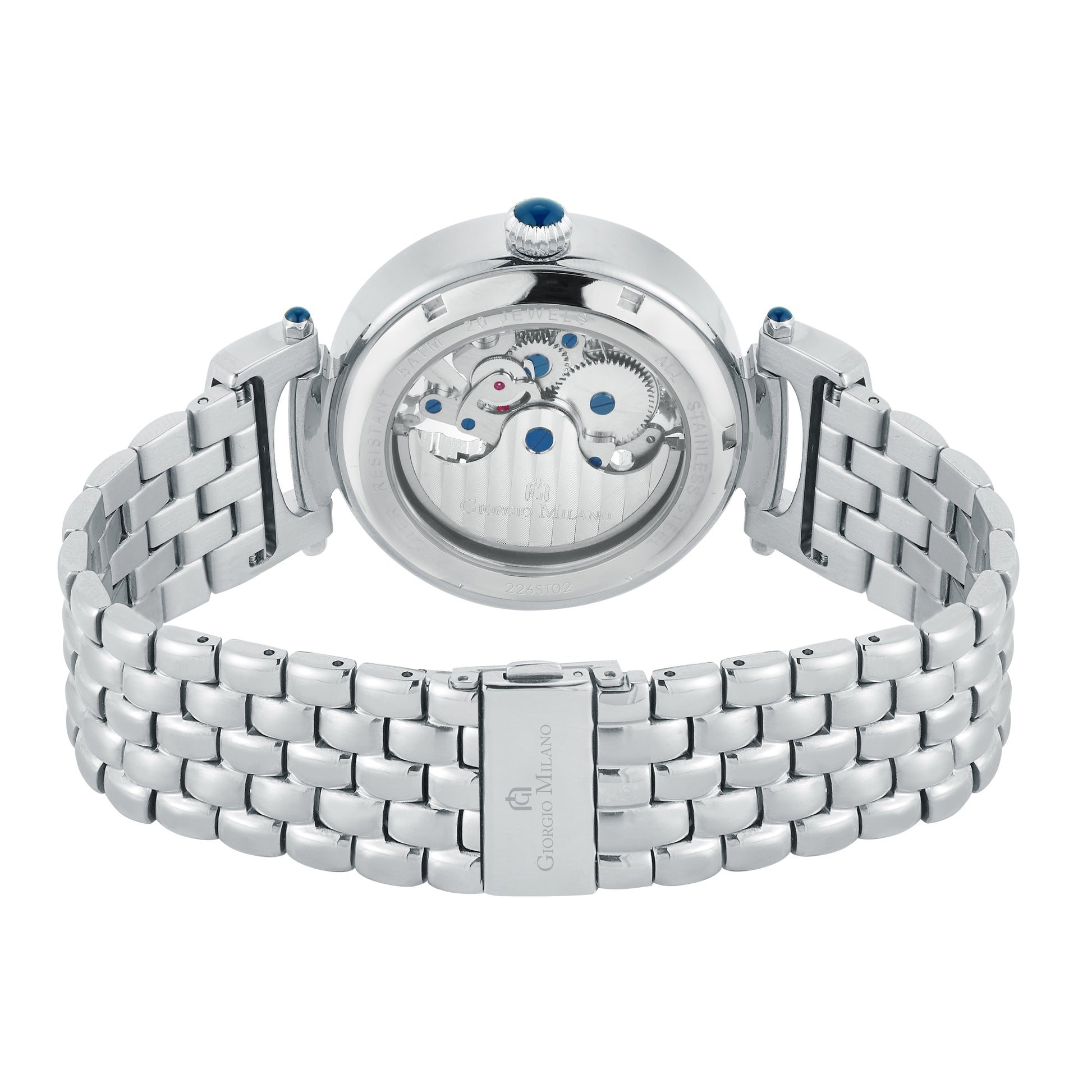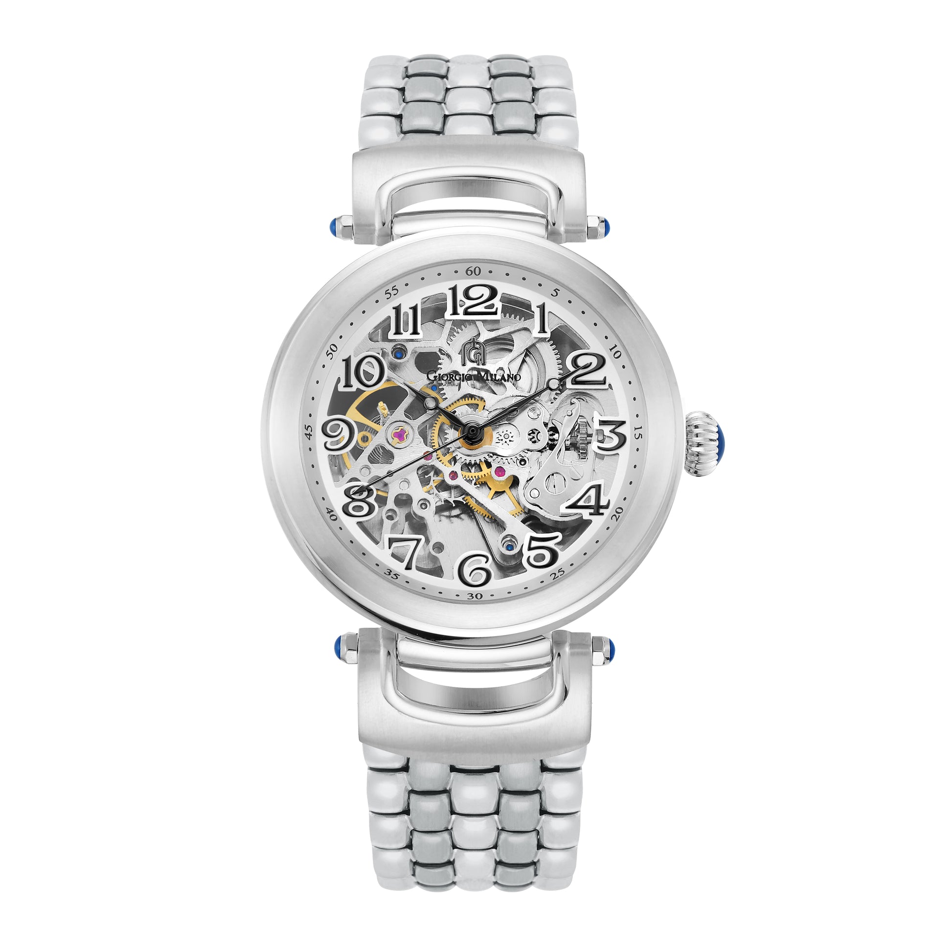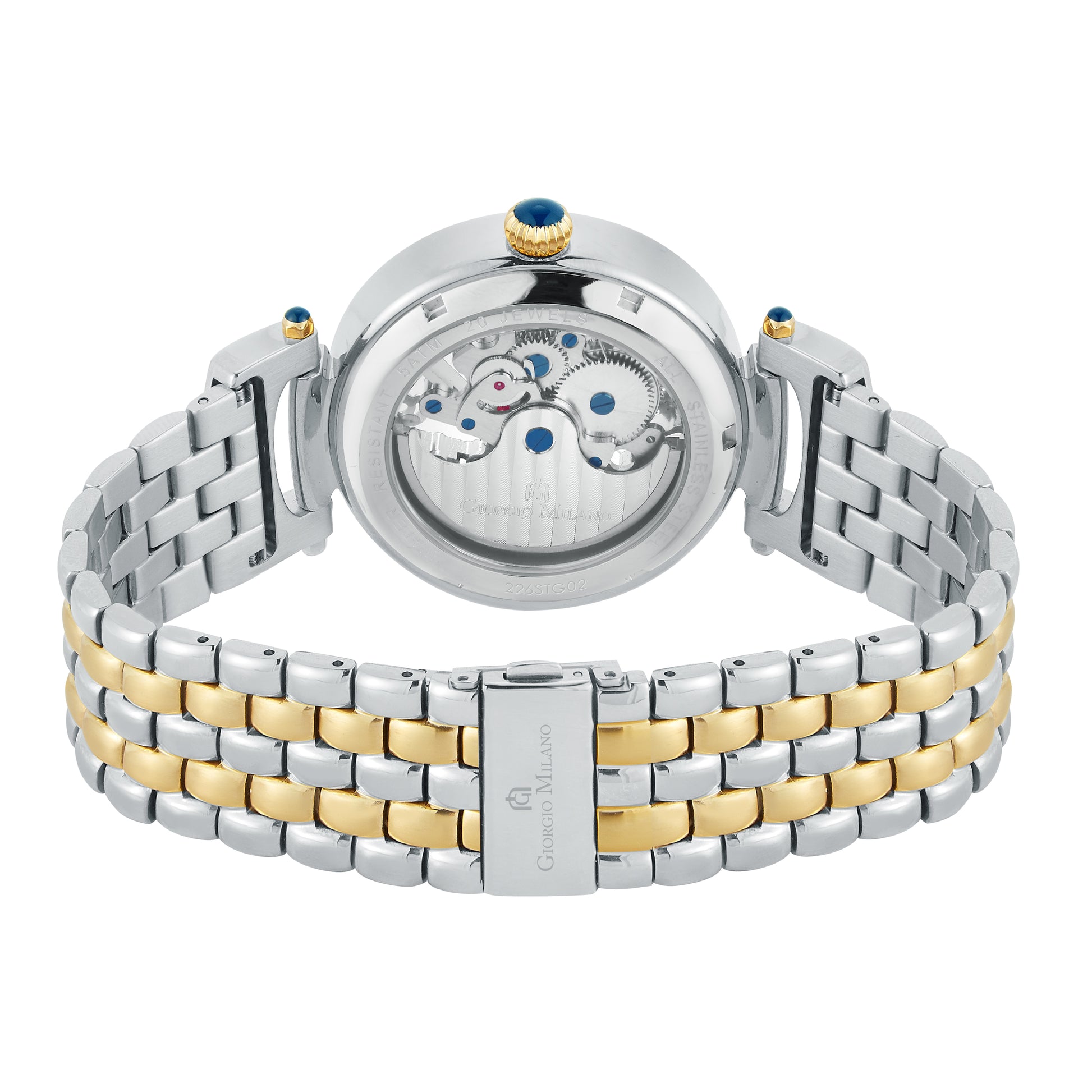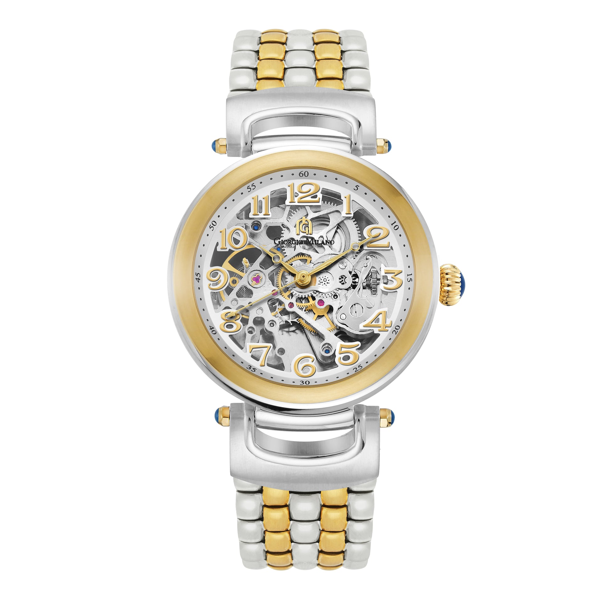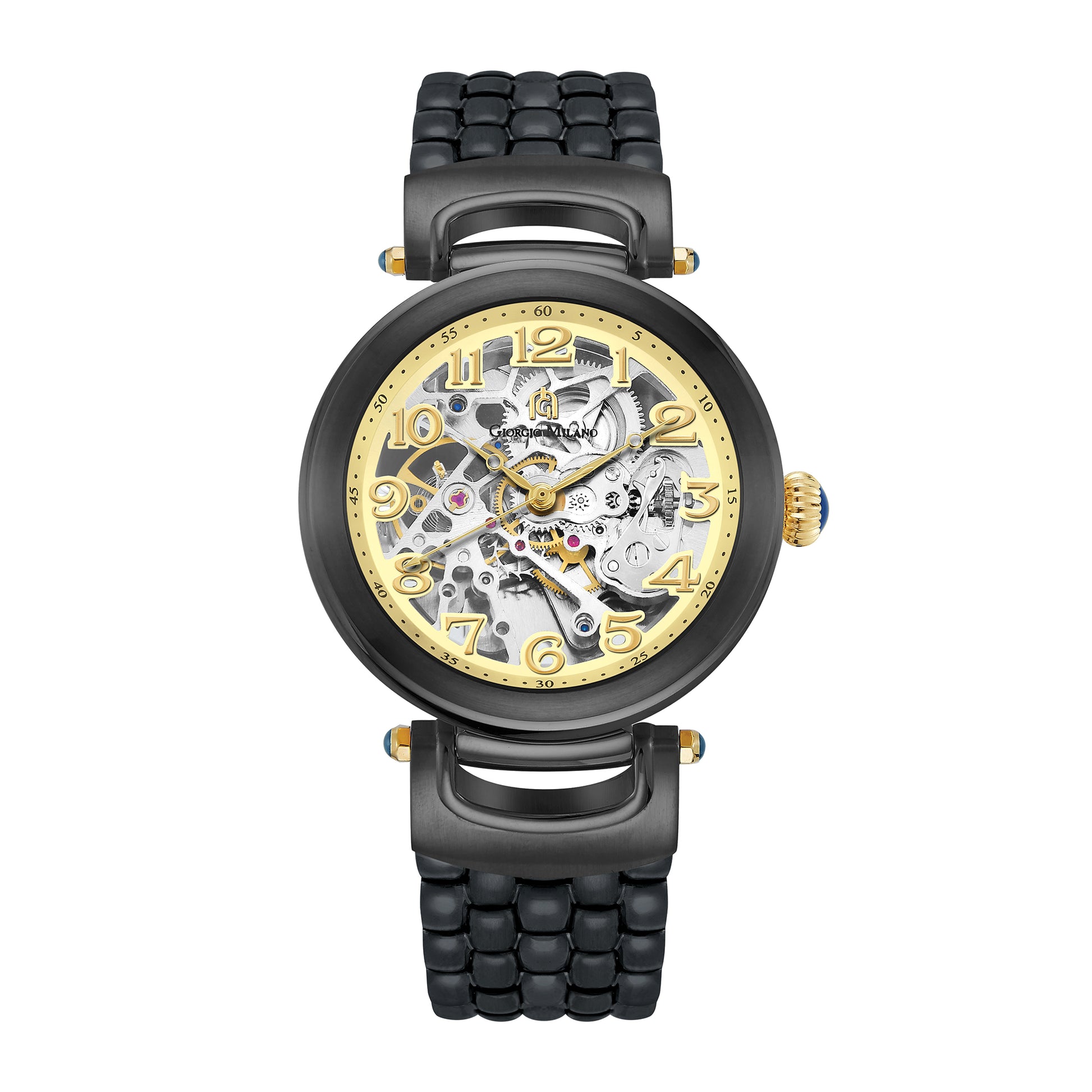 Los 4 colores son impresionantes: dorado, plateado, dorado/plateado en dos tonos y negro. Pero los sombreados sutiles en la cara de la versión negra le agregan un toque de diseño. Hacen que seguir el funcionamiento interno de su GILDO Skeleton sea un poco más fácil debido al contraste de color. El movimiento automático mantiene la hora perfecta. La caja de tamaño generoso les da espacio a esos engranajes para hacer lo suyo.