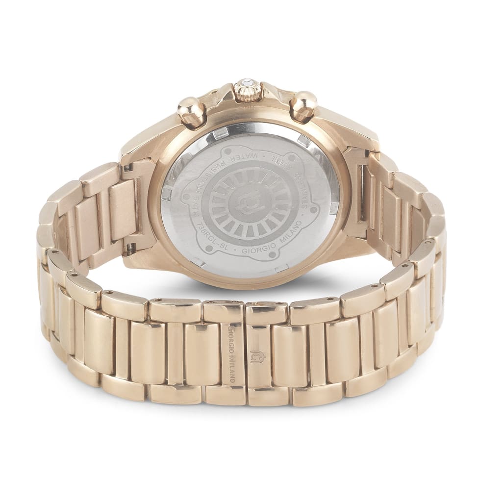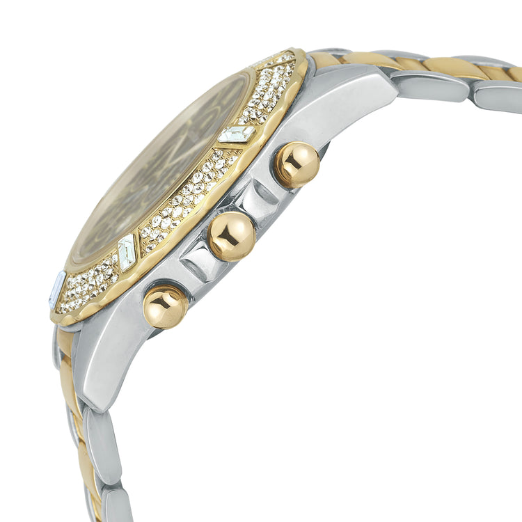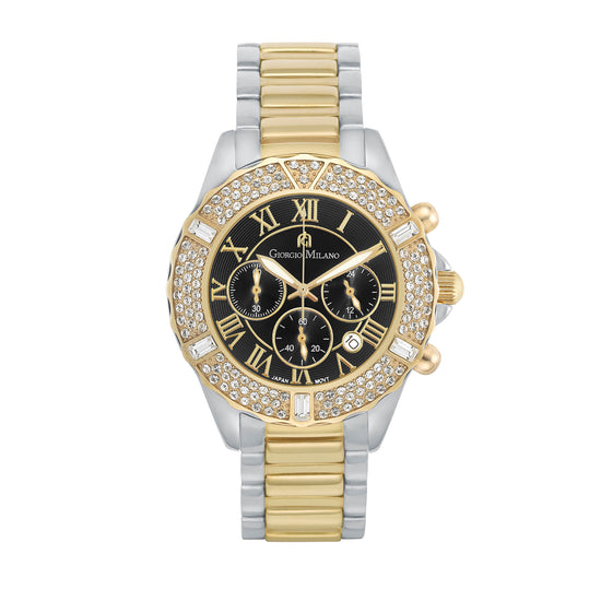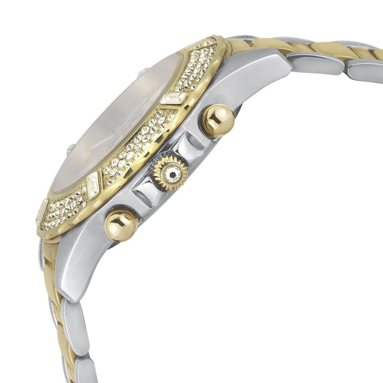 El movimiento de cuarzo automático no necesita cambiar la pila y mantiene la hora con precisión, incluida una función de cronómetro. Dentro de todos esos cristales hay un juego completo de números romanos. Apuesto a que no hay muchos cronógrafos automáticos para mujer con números romanos y cristales incrustados. ¡Suena como un gran tema de conversación!