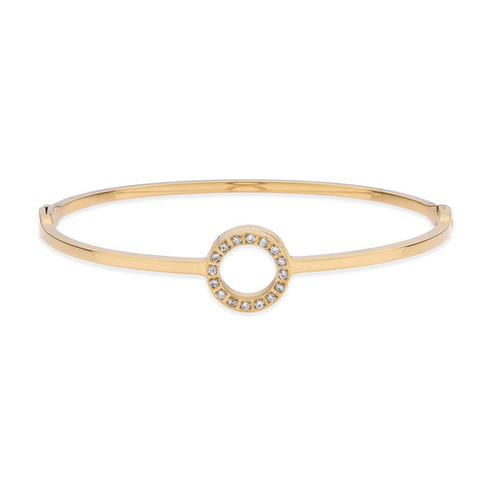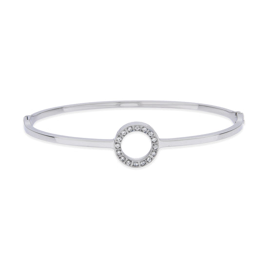 Expertly crafted from premium stainless steel, this sleek bracelet showcases a high-polish plated finish and a signature open circle centerpiece adorned with brilliant clear crystals. Designed for versatility and effortless style, it’s perfect to wear solo for a minimalist statement or stacked with other bangles for a layered, luxurious look.