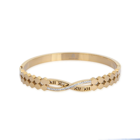 The W4103 Roman Numeral Bangle blends modern geometry with timeless elegance. Crafted in stainless steel with IP Gold or Silver plating, it features a linked band and an infinity-inspired center engraved with Roman numerals and accented with cubic zirconia. A sleek, structured piece designed for everyday wear or elevated styling.