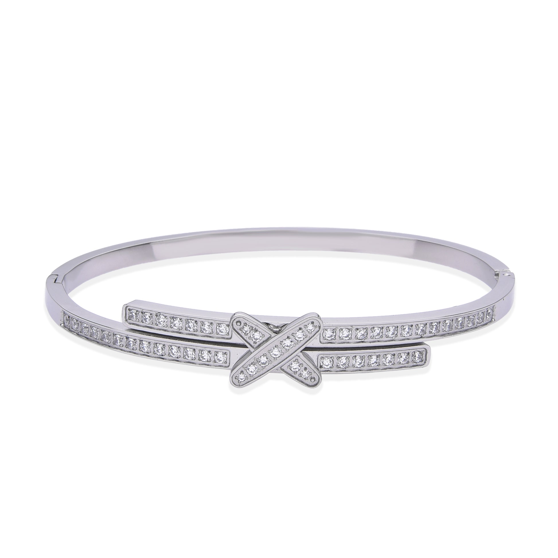 A sophisticated statement of elegance, this exquisite stainless steel bangle blends IP Gold and Silver plating for a luxurious finish. Featuring two parallel rows of Crystal stones, it is beautifully joined at the center by an X-shaped design, adding a touch of timeless glamour. Perfect for any occasion, this bangle effortlessly elevates your style with its refined craftsmanship and sparkling brilliance.