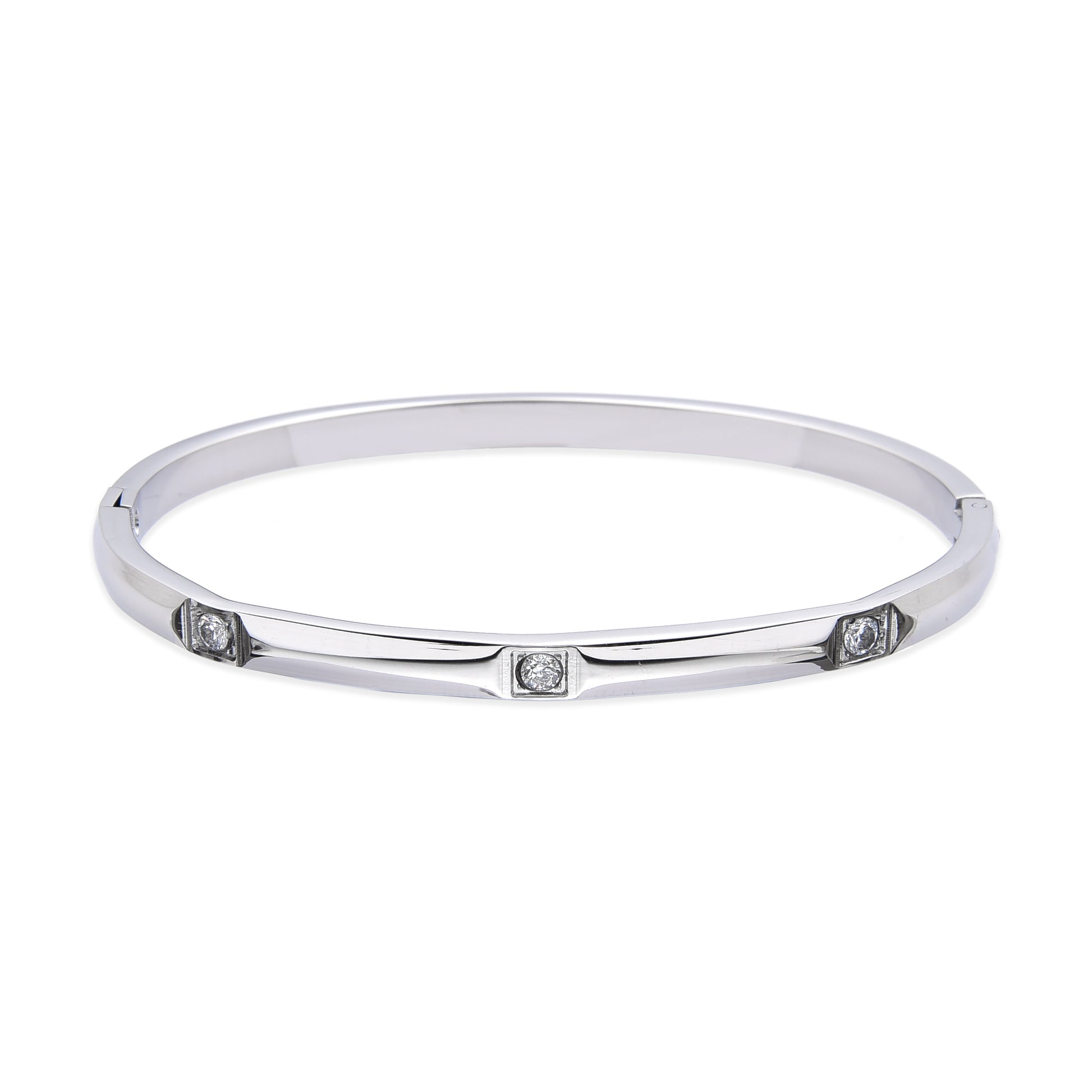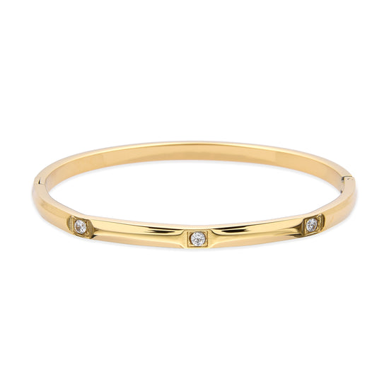 The W4147 Bangle Bracelet offers a refined minimalist design crafted in high-quality stainless steel. Available in both silver and gold IP Plating finishes, this classic piece features three bezel-set cubic zirconia accents that provide a subtle touch of brilliance without overpowering the clean silhouette. Its slim, structured profile makes it an effortless accessory for everyday wear as well as formal occasions.