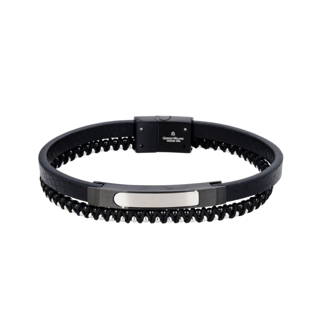The Giorgio Milano 2035 bracelet delivers a refined blend of modern style and artisanal detail. Featuring a smooth leather band paired with a tightly braided wrap strand, this piece highlights a polished stainless-steel ID bar for a clean, contemporary look. Accented with IP Gold or Steel plating and secured with a magnetic clasp, it’s a versatile accessory designed for everyday sophistication.