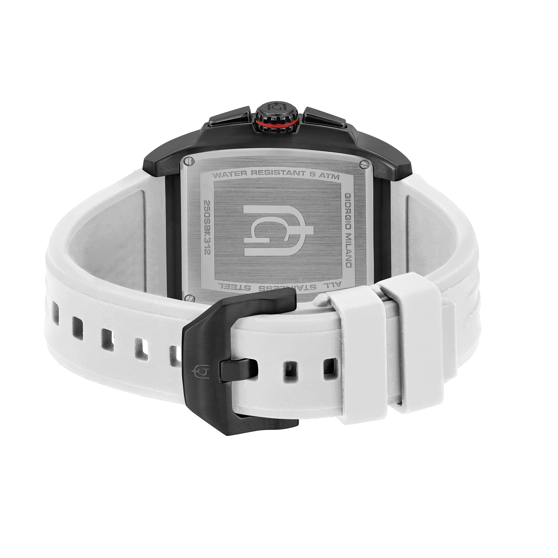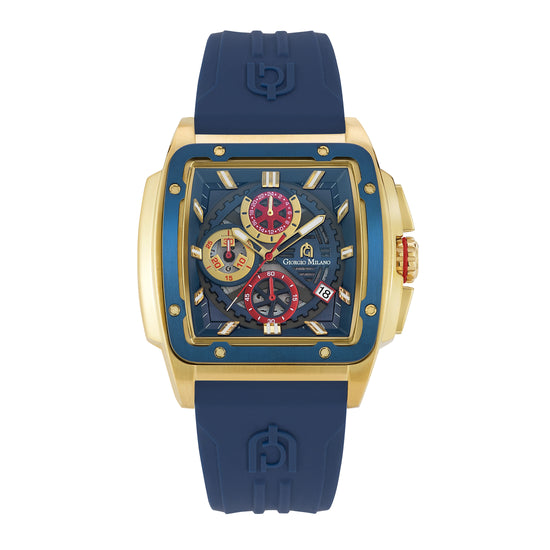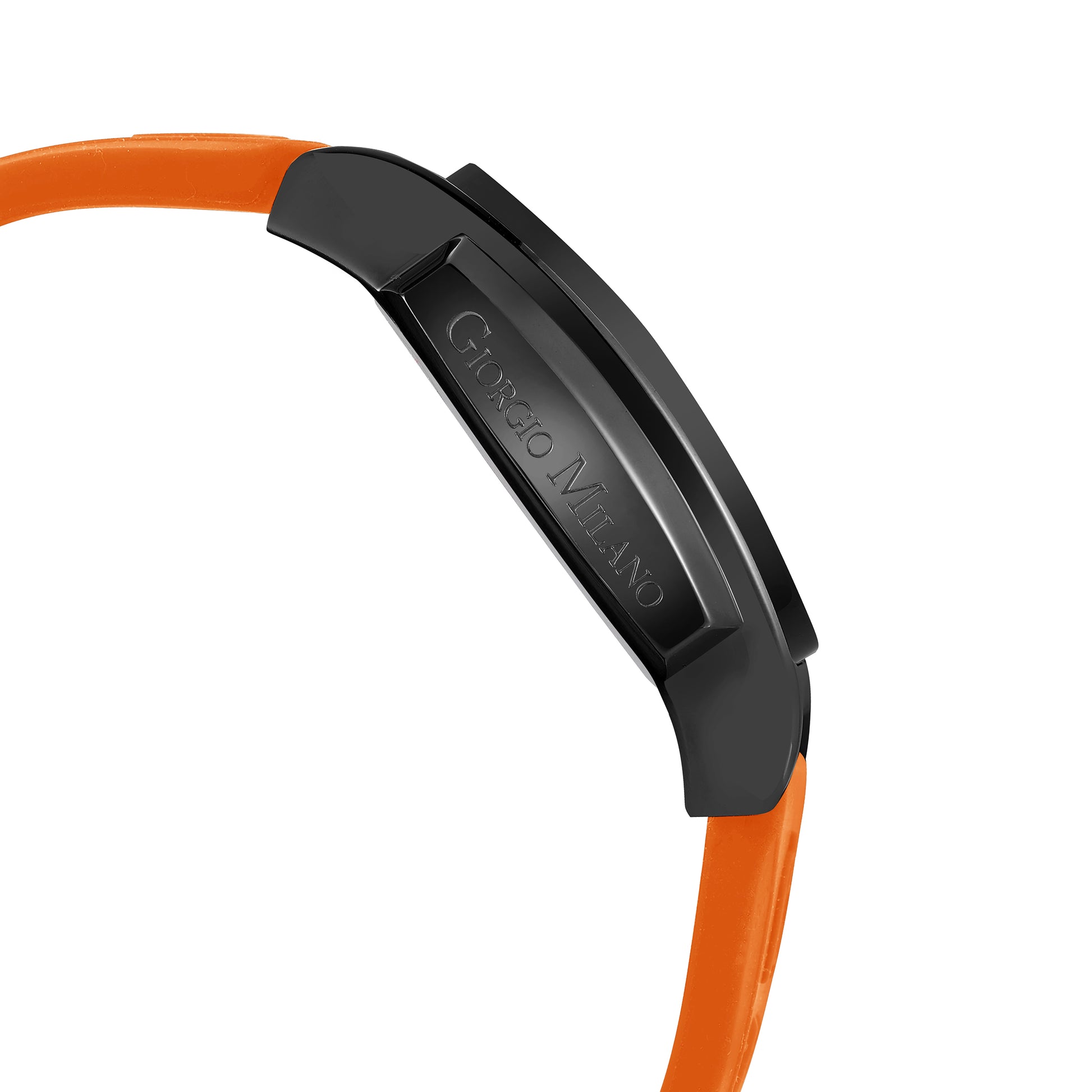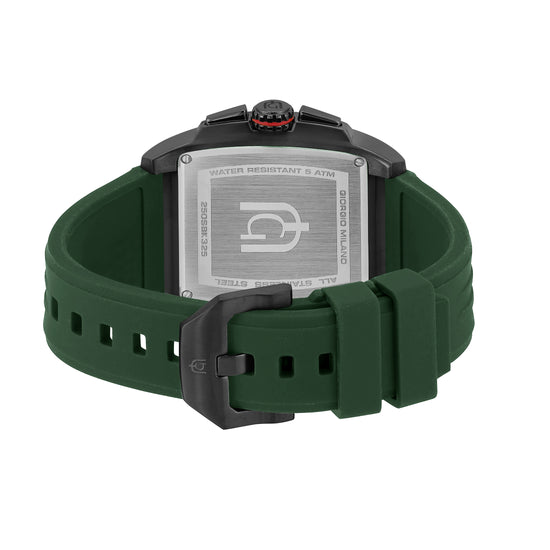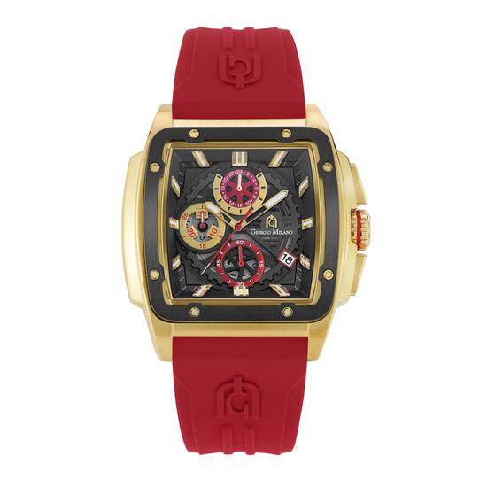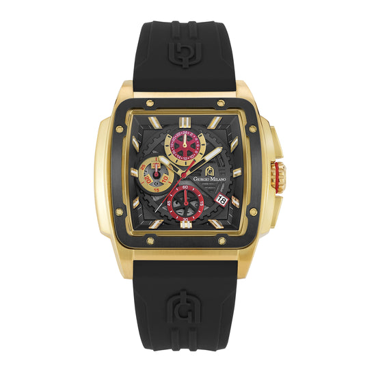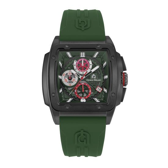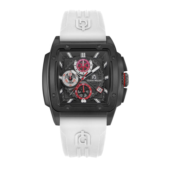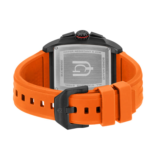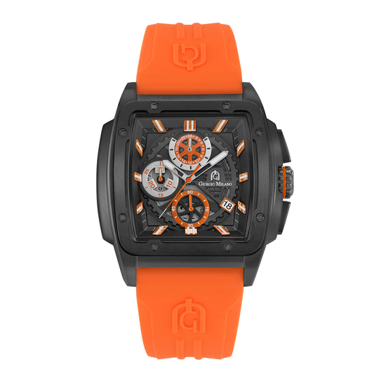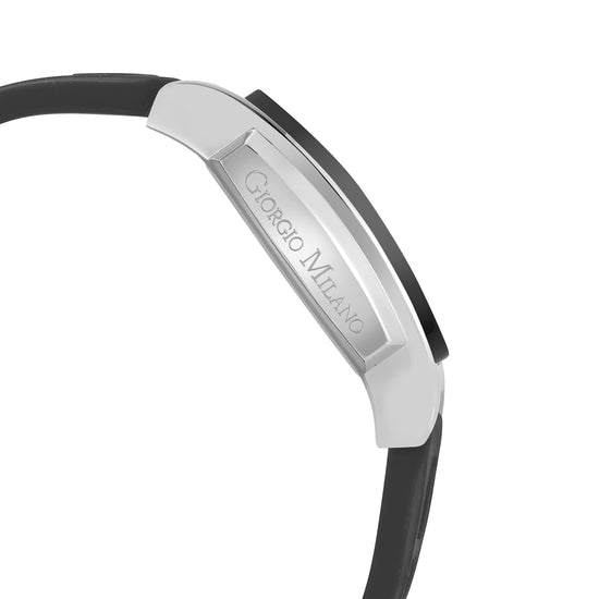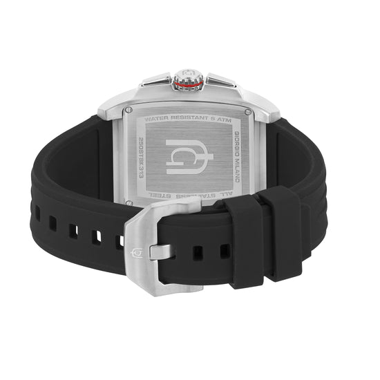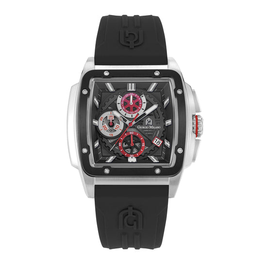 The Giorgio Milano Model 250 is a luxury men’s stainless steel chronograph watch designed for modern sport elegance. Featuring a bold 45.5mm square case, precision quartz chronograph movement, hardened mineral crystal with anti reflection coating, and 100m water resistance. This sport luxury timepiece delivers reliable performance with refined everyday style. Finished with a durable silicone strap for superior comfort and versatility.
