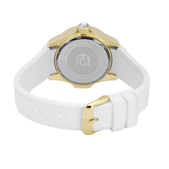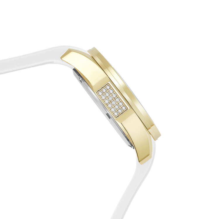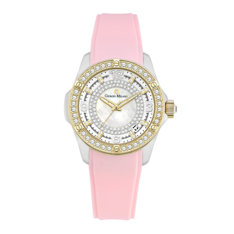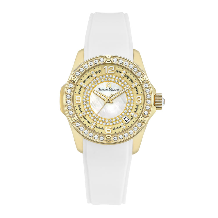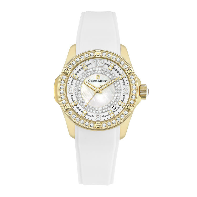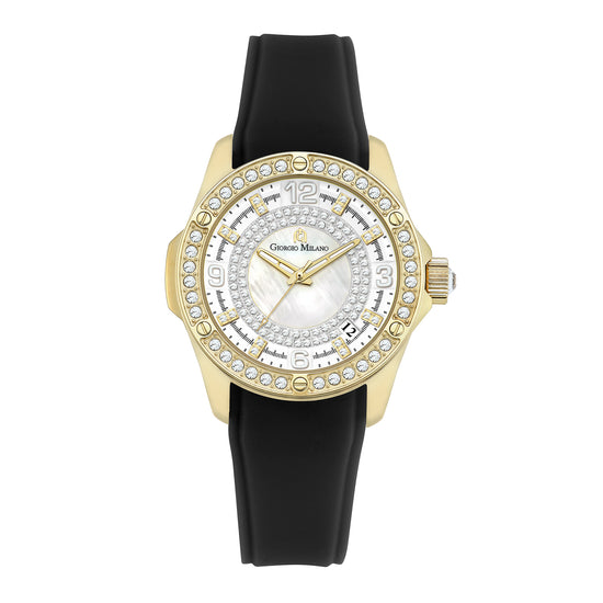 The EVE 241 is the perfect blend of elegance, sophistication, and luxury. Featuring a stunning White Mother of Pearl dial that shimmers with every movement, this timepiece is designed to catch the light in mesmerizing ways. The bezel is adorned with Cubic Zirconia's, and the inner circle of the face is further enhanced with two rows of these sparkling stones, adding an understated yet extravagant touch to the overall design. Even the opposite side of the case is decorated with tiny Cubic Zirconia's, making this watch truly captivating from every angle.
