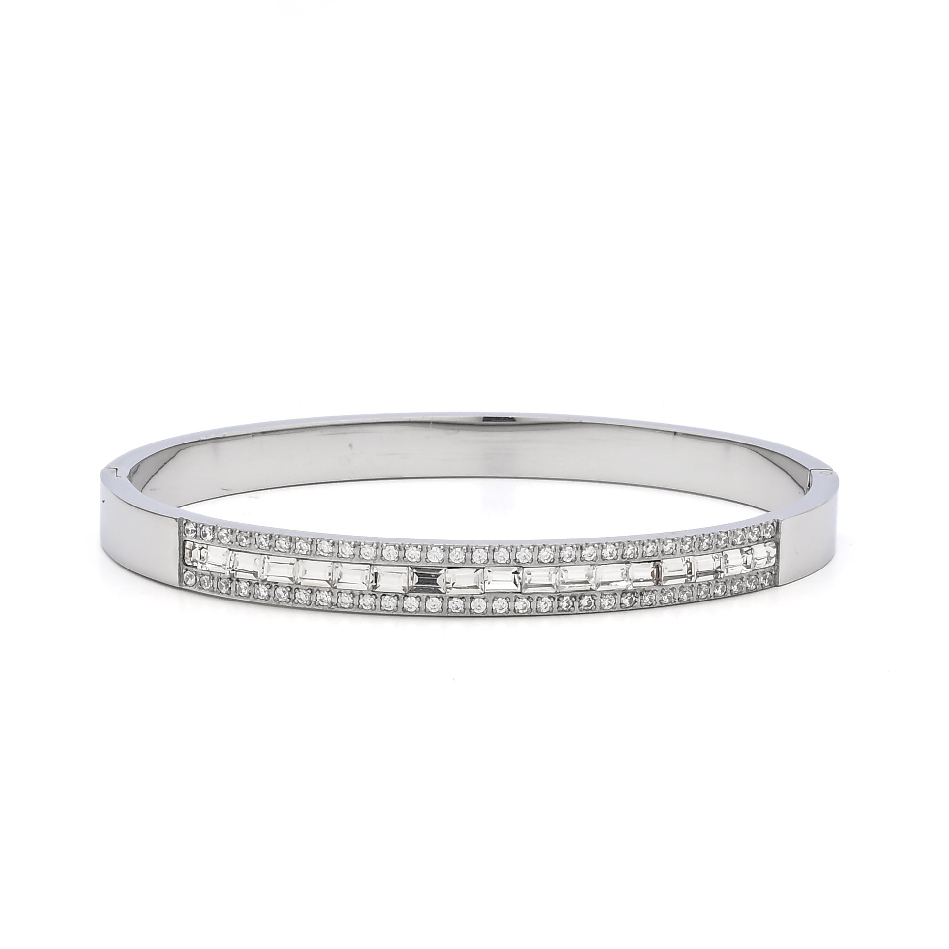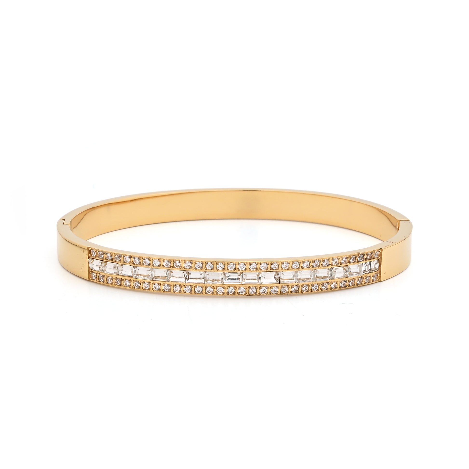 Design: Slim hinged bangle with center baguette CZ detail and pavé accents